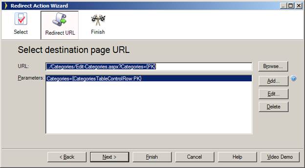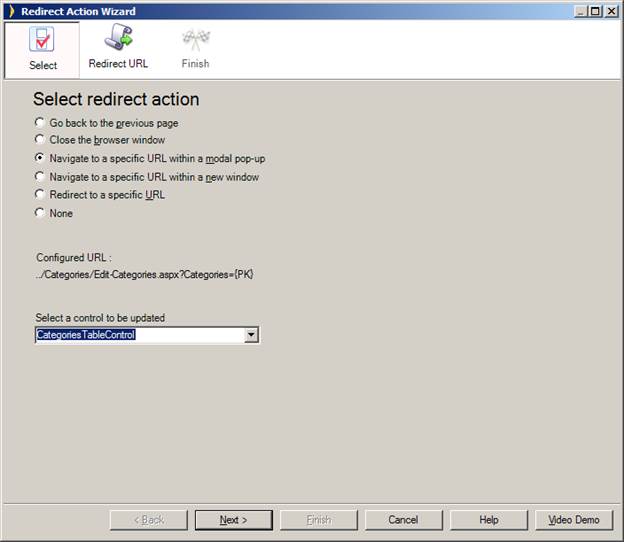 Step 2: Now in the Redirect Action Wizard you can specify an action for your button: