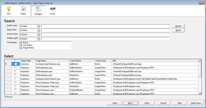 The Batch Wizard allows you to quickly search through the whole application and change button behavior globally. Once you choose an action at Select step and proceed to the “Configure” step, you will see a list of controls that satisfy the search criteria. You can filter buttons by Folder name, Page name, Control name, redirect URL or button type.