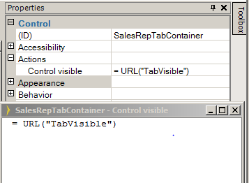 By default, the SaveAndNewButton has a visible property, = URL(“SaveAndNewVisible”). The Tab Containers has a visible formula, = URL(“TabVisible”). As a result, when SaveAndNewVisible or TabVisible is passed as False through the URL parameter, the corresponding button or tab containers will be invisible.