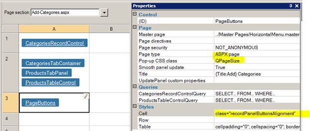 Now you need to change top position of the footer with buttons, i.e. replace QPPageButtonsContainer style. Select the pop-up page in the Application Explorer in Iron Speed Designer, navigate to the page level section where you can see “PageButtons”, select the page button cell and set the cell attribute to your new style (ex QPPageButtonsContainer1).